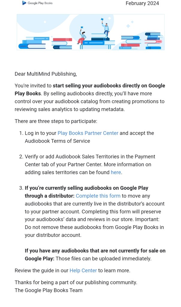 It also doesn’t help that audiobook dealers and makers, such as Google Books, Draft2Digital and Apple are pretty much urging authors to switch to AI voice. Only a couple days after the Spotify debacle, did Google Books come out with this email: