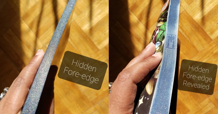 I’m a bookbinder and an author. So seeing the sprayed edges/gilded edges craze is a bit on the odd side for me. The edges are indeed pretty – but not worth the major jack up in price. The sprayed edges are all you get sometimes, no autograph in the book or anything else special. Just something cheap added to hike up the price and to super sell first edition copies (so a publisher (a traditional one, particularly) can say a book did well, even if no one cracked open their copies). For me, it’s just a bit on the weird side.