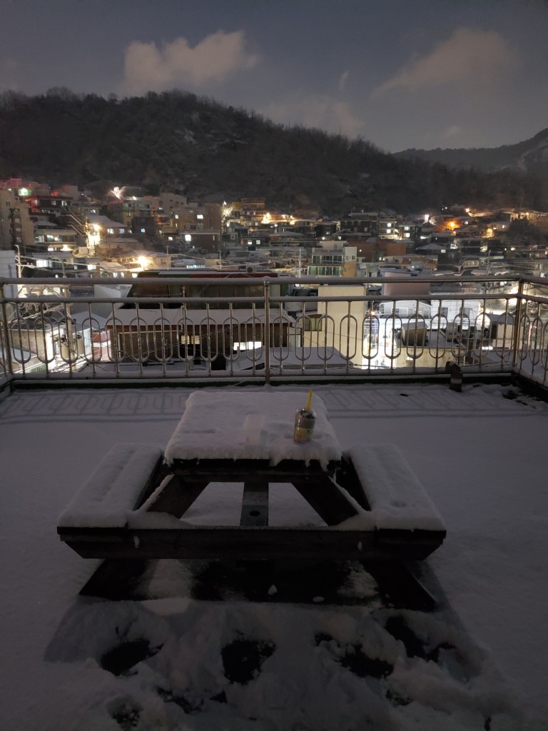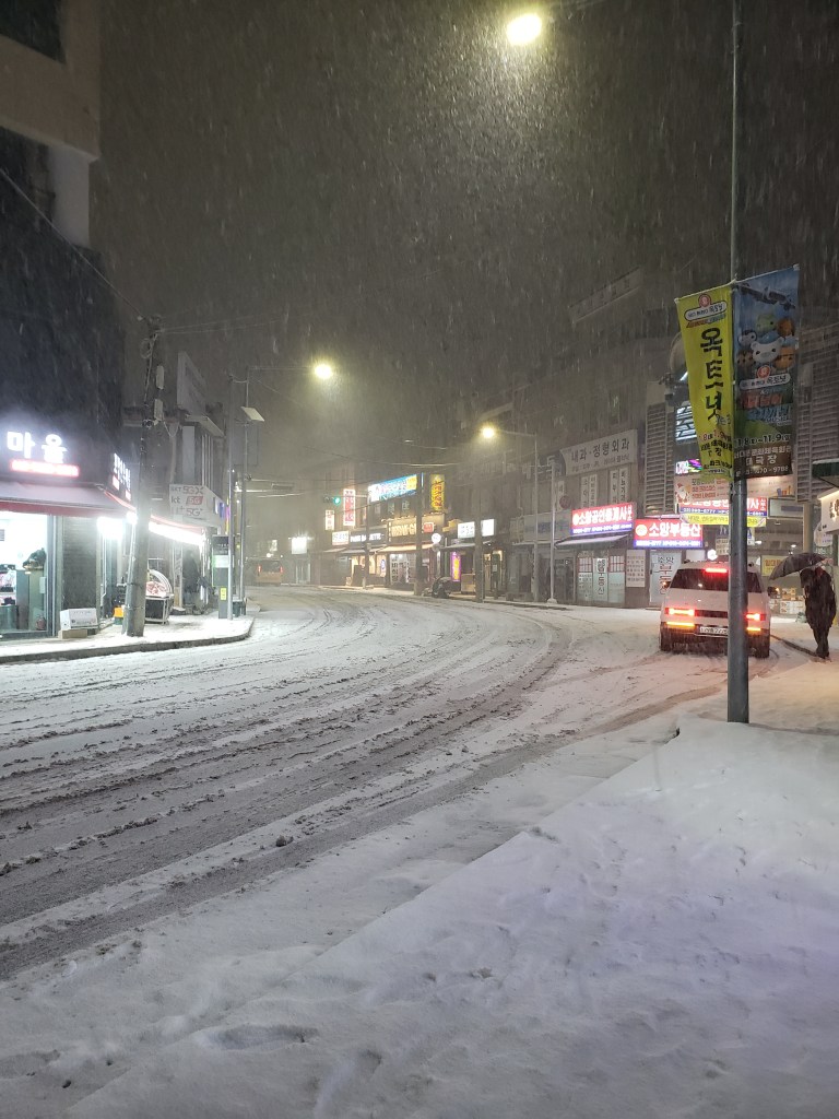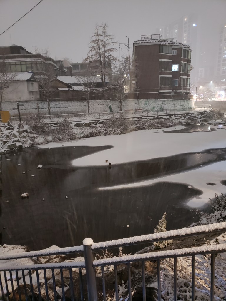 Also, they don’t get a lot of snow in Seoul. Or rain (I stayed Oct-Jan). Any weather event I experienced is fairly short lived. They consider heavy snow 3 or 4 inches. In Maryland, that’s just regular snow. It’s very pretty tho. The younger folks love playing in it and snow abatement is very WE’RE ALL GOING TO DIE, HERE IS YOUR EMERGENCY ALL CALL. EXPECT THREE INCHES OF SNOW AND COLD AIR emergency phone warnings. Granted, people drive in Seoul as if they’re skating their car on ice when its bright, warm and sunny outside so perhaps that’s a reason. I’m very used to the American “It’s gonna snow. Feel free to die in it. Maybe have some water in your bathtub, idk” style of weather forecasting. Baltimore just got dumped with a bunch of snow and a lot of it still hasn’t cleared up or been cleaned off. It’s snowcrete, now. Outside my apartment in Seoul, there was a small river and when it froze – not even all the way – kids would play on it. I’m used to cold weather horseplay but these kids were being ultra risky because there were still weak parts of ice atop a running river. None fell in but there were a lot of slips and slides.
